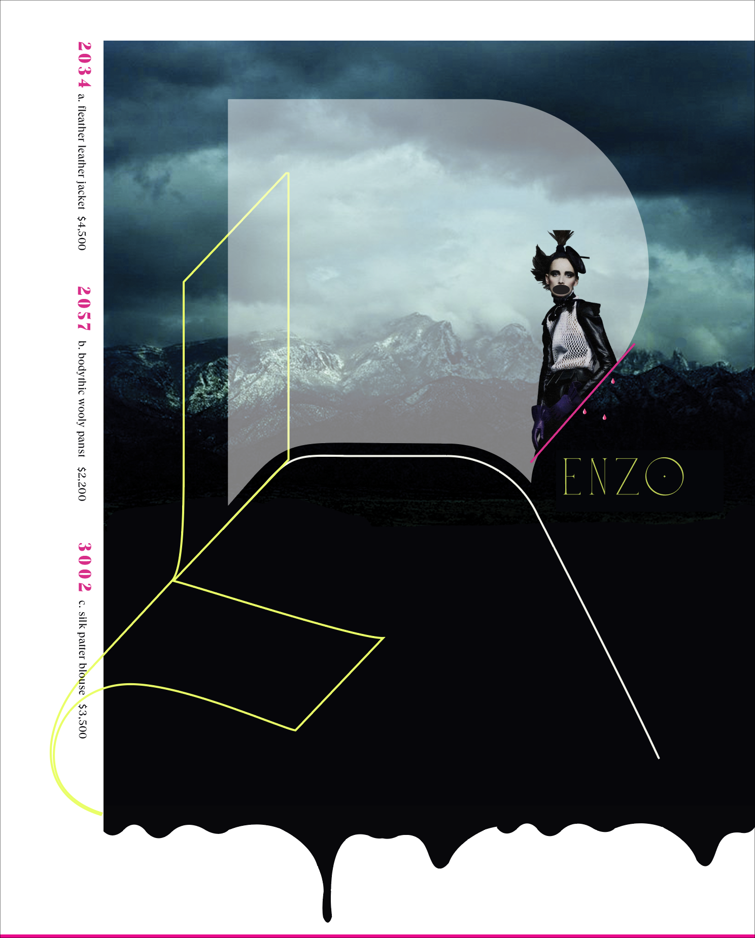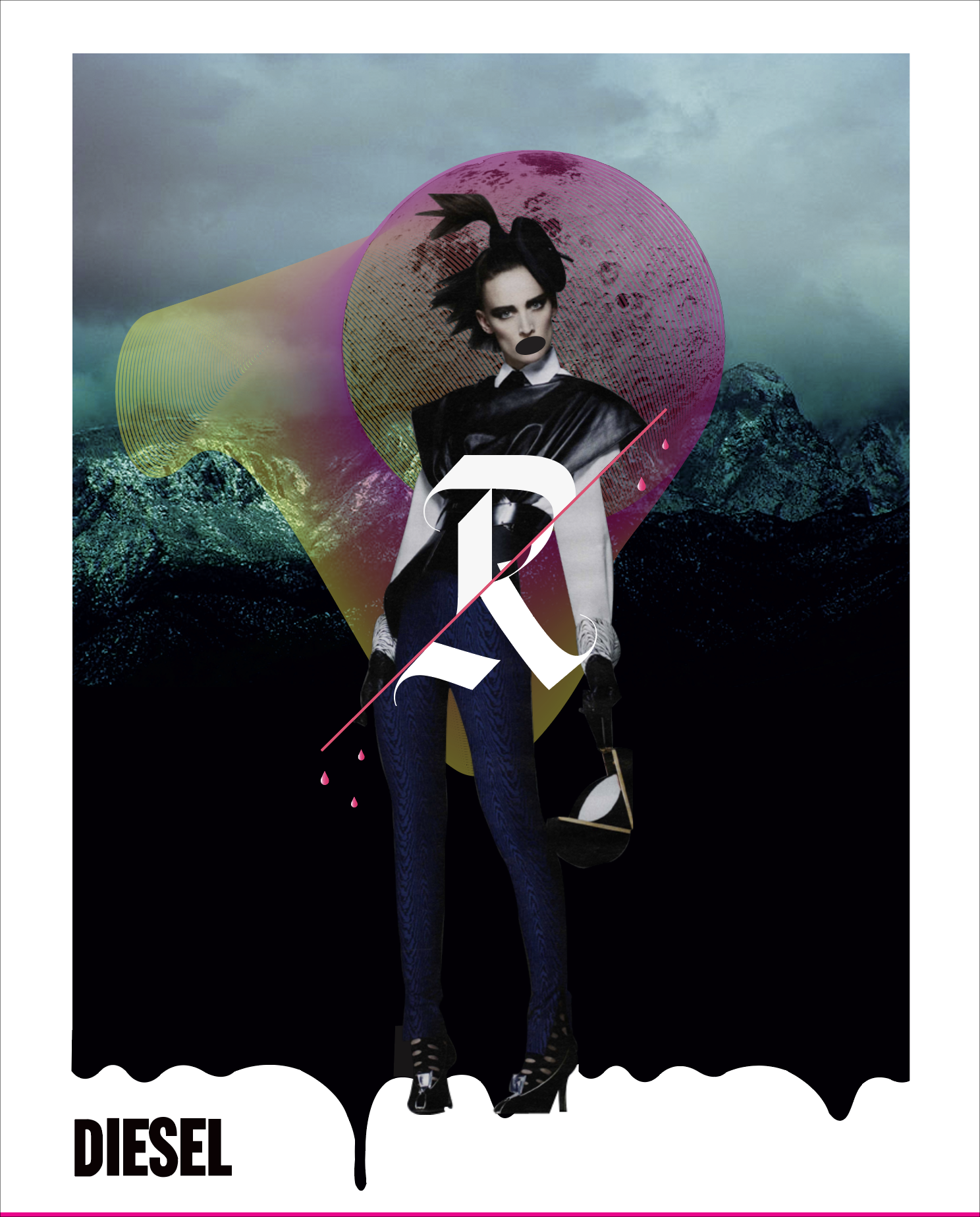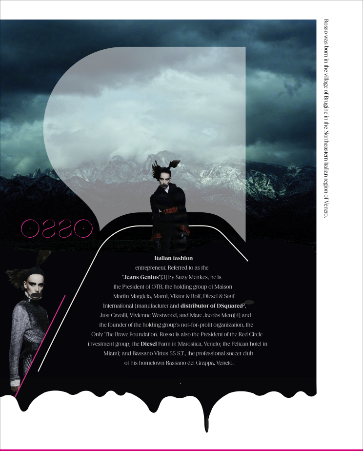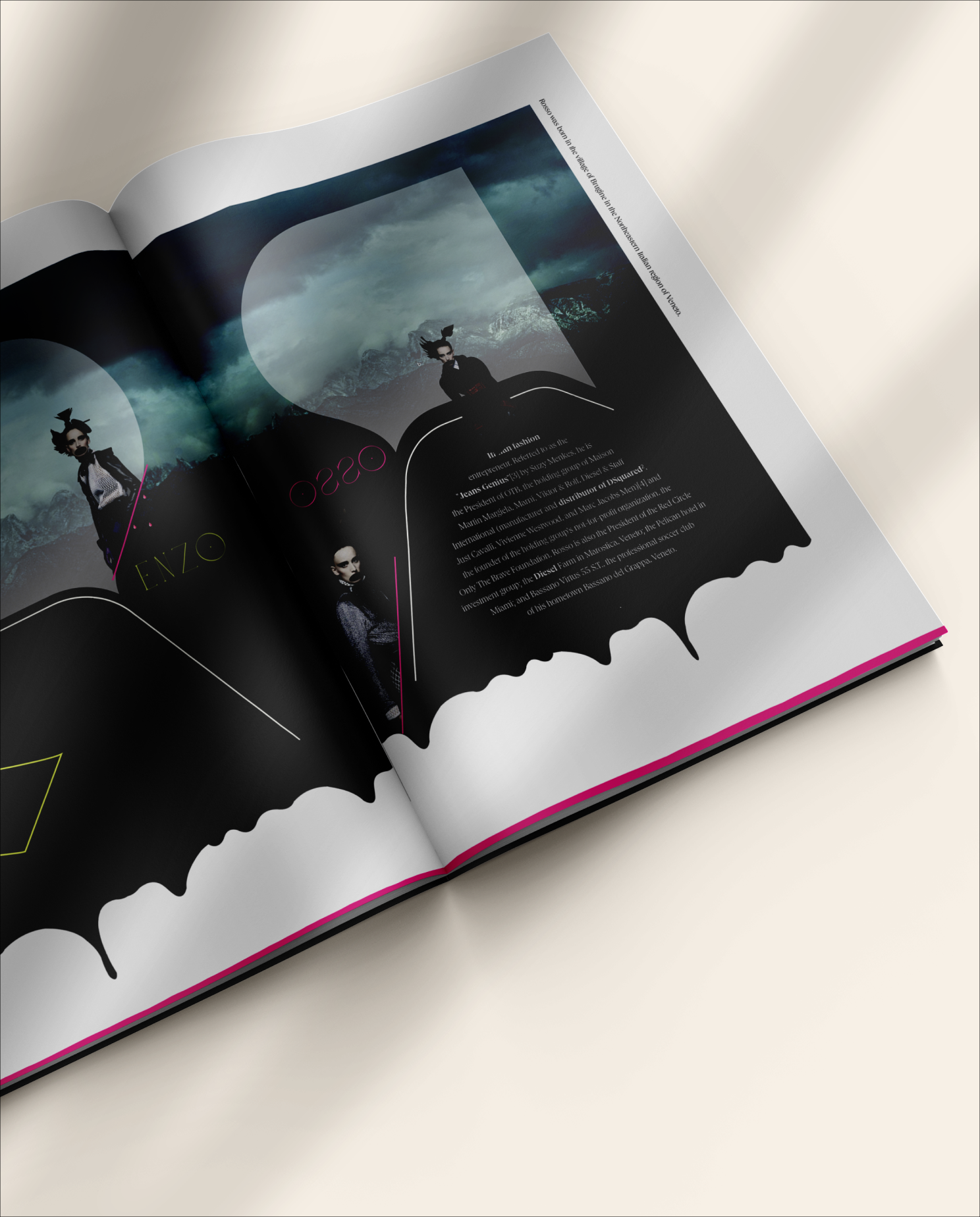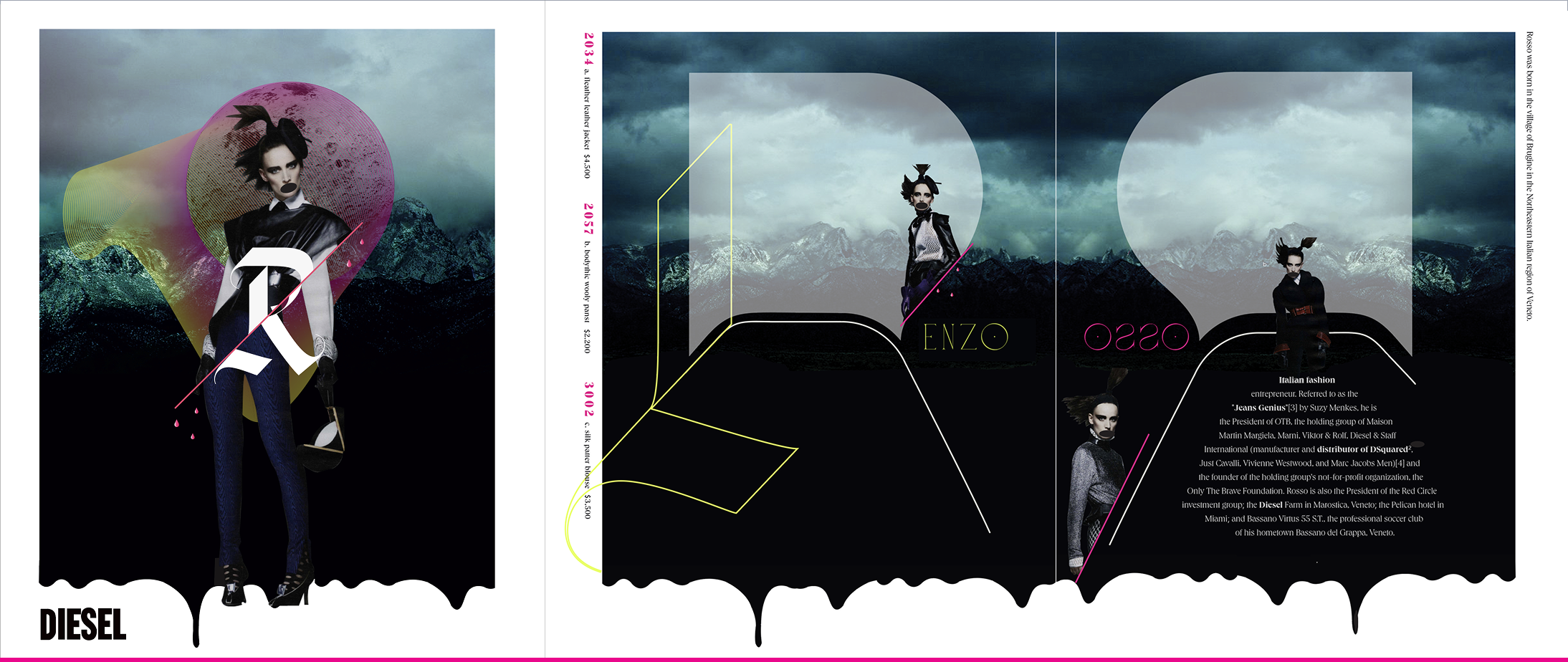 Renzo Rosso built Diesel on provocation — raw, dark, and unapologetically bold. This self-initiated editorial pays homage to the man behind the brand through a series of moody, heavily art-directed spreads. Original landscape photography was composited with brand imagery — layered with hand-placed moons, dripping ink edges, and oversized typographic treatments that spell out ENSO and OSSO across the spreads, a visual play on the Renzo Rosso name. Each page pairs styled fashion photography with clothing callouts, blending dark editorial storytelling with commercial intent.